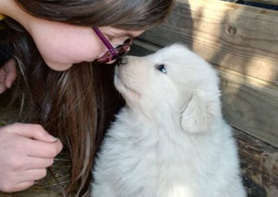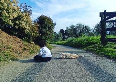 Abbiamo studiato come lavorare sulla corretta gestione dei cuccioli, sulle tecniche di educazione, sulle pratiche per aiutare cani con problematiche caratteriali, sulle attività legate all’addestramento ed agli sport cinofili. Ed infine, per quanto riguarda le attività sociali con i cani, prendendo l’abilitazione come coaudiutore del cane (operatore riconosciuto negli interventi assistiti con animali, Pet terapy). Siamo convinti che una corretta e piacevole relazione tra noi ed il nostro compagno di vita, passi necessariamente per una corretta socializzazione ed educazione alla vita antropizzata.Attualmente le attività cinofile principali che si fanno in fattoria sono legate all’educazione e rieducazione dei cani, all’addestramento in varie attività cinofilo/sportive, alle attività sociali.
